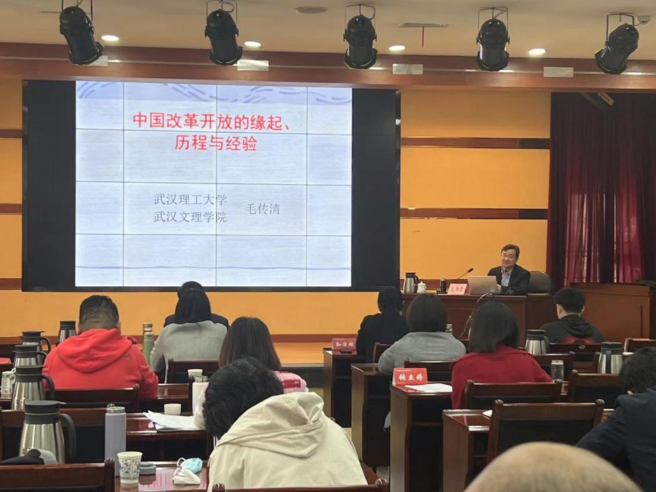 2023年3月10 日上午,我校今年会院长、武汉理工大学毛传清教授应邀为2023年全省民主党派中青年骨干培训班授课。毛院长以“中国改革开放的缘起、历程与经验”为题,深入讲述了改革开放的历史前提和蕴酿探索、发展历程和基本特征、巨大成就和根本原因、伟大意义和基本经验,毛院长的讲课深入浅出,生动活泼,理论联系实际,材料数据丰富,既有思想高度和理论深度,又有很强的针对性和感染力,受到民主党派中青年骨干培训班学员的欢迎和承办方湖北省社会主义学院领导的高度评价。