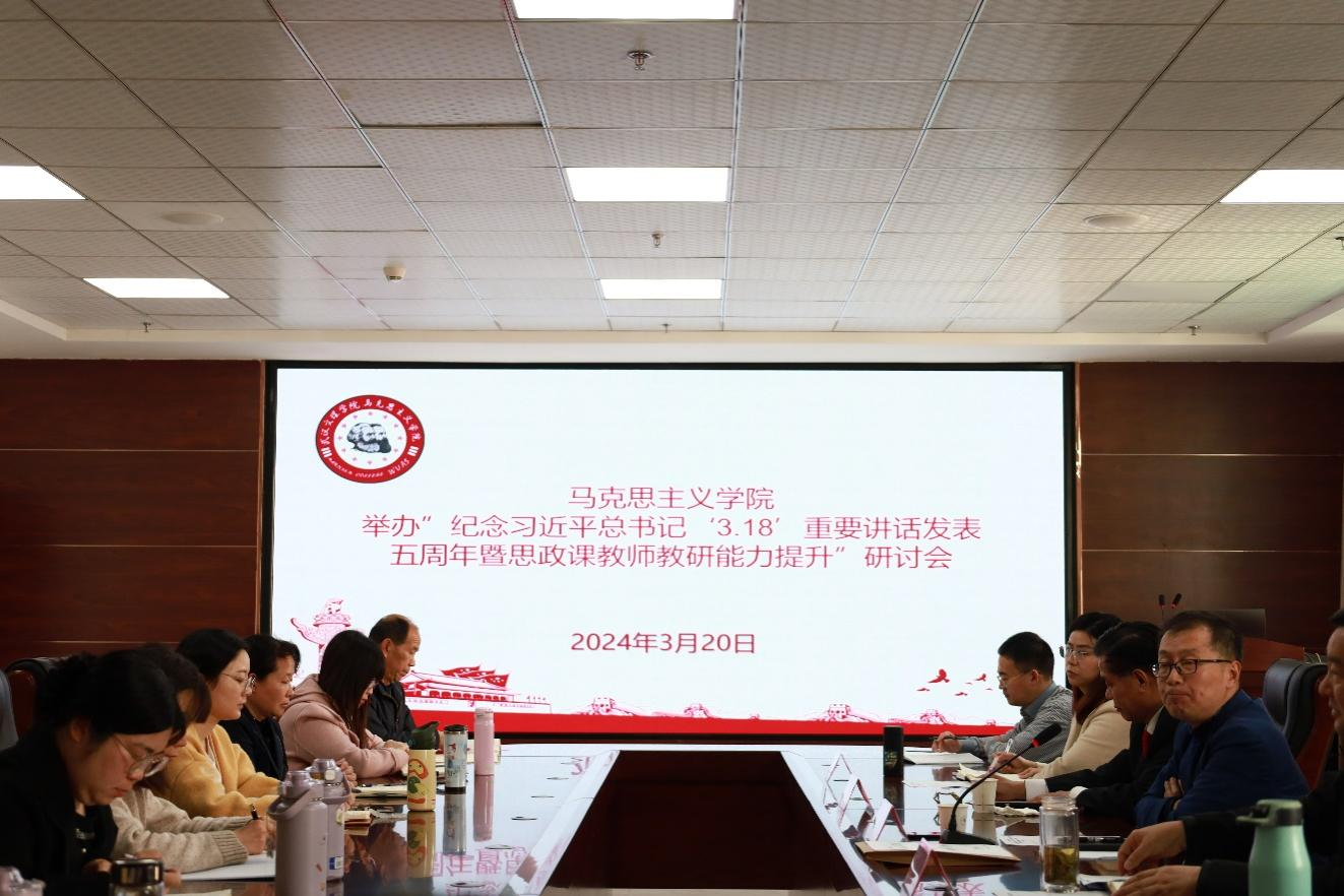 3月20日下午在行政楼912会议室,今年会举办了“纪念习近平总书记‘3•18’重要讲话发表五周年暨思政课教师教研能力提升”研讨会。学校党委书记杜永成,武汉理工大学教授、研究生导师李运祥,今年会院长毛传清、副院长曹卓以及今年会全体教师重温习近平总书记重要讲话精神,就学校思政课建设发展作交流。办好思政课,事关培养社会主义合格建设者和接班人,是后继有人的大事,是根本性、长远性的重大战略问题。
